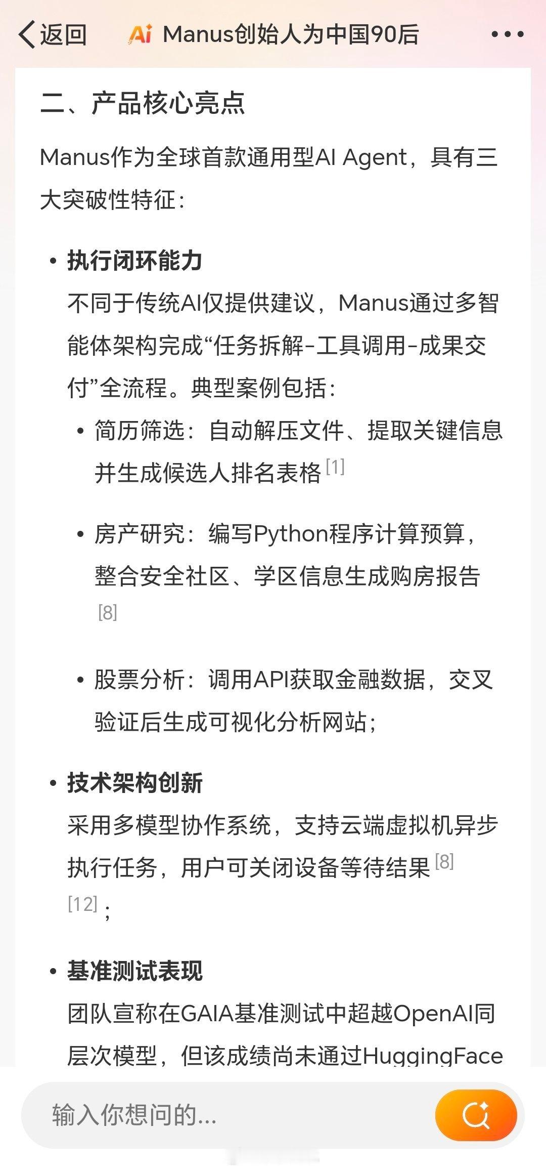 它是全球首款通用型AI Agent(自主智能体)产品,由中国90后创始人肖弘带领团队打造。肖弘此前就有创业佳绩,其创立的夜莺科技获得腾讯、真格基金数亿元投资。此次推出的Manus,性能更是亮眼,在GAIA基准测试中超越OpenAI同层次大模型 。
