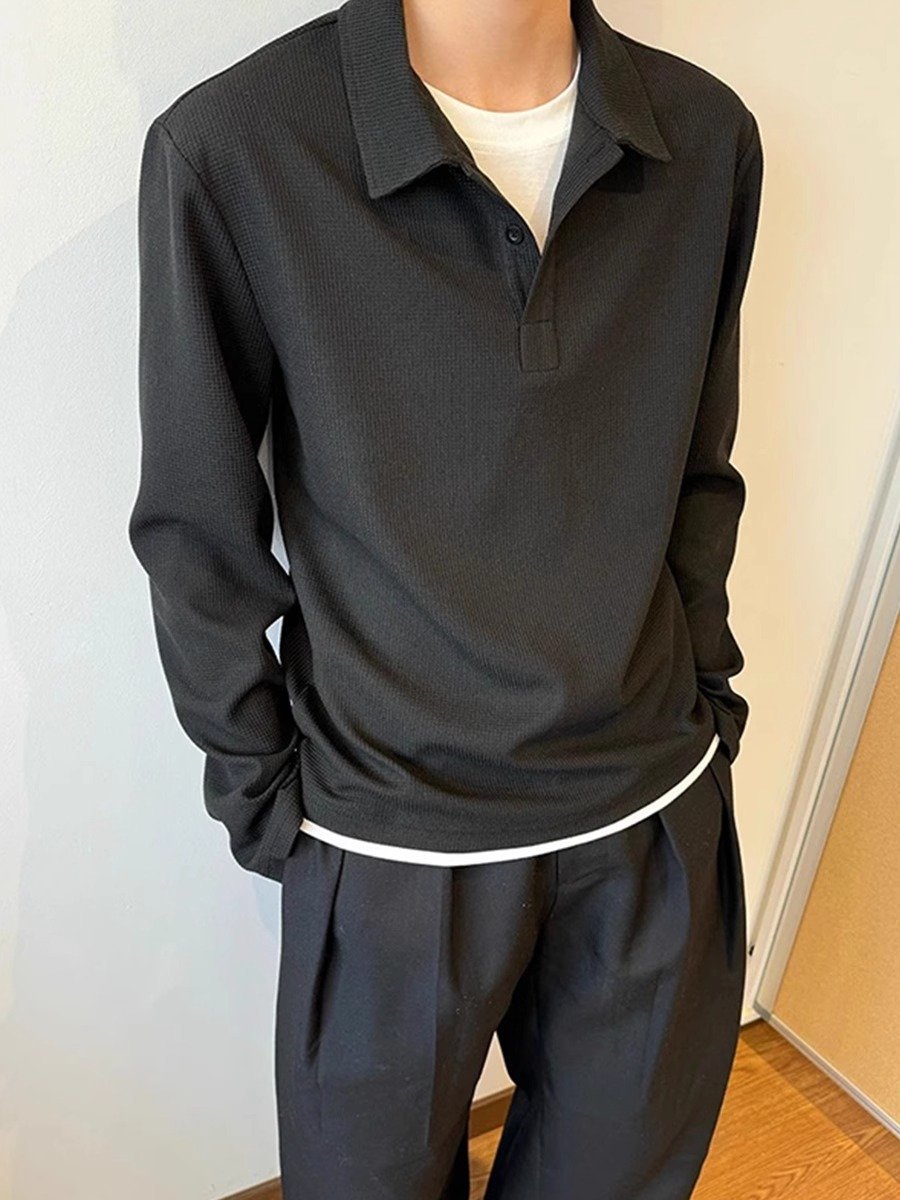 花灰色华夫格亨利领长袖t恤男夏季美式翻领