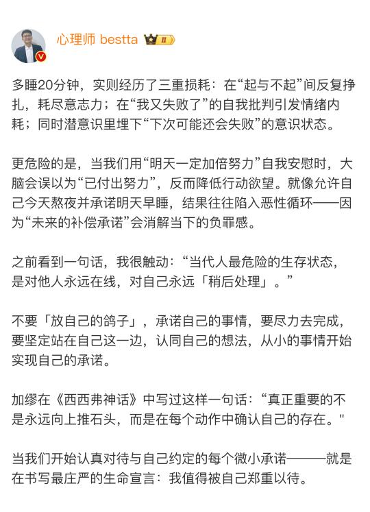 我发现大家可能会有这样的经历,明明在日记本上郑重写下“明早6点起床学习”,可当闹钟响起时,却条件反射般按下“再睡10分钟”,直到最后一刻才匆忙冲出家门;又或是发誓“今晚必须完成方案”,却在刷短视频的循环中耗光整晚时间。那些对自己的承诺,像一张张被退回的空头支票,表面上只是“暂缓执行”,实则悄悄蚕食着内心的秩序感。