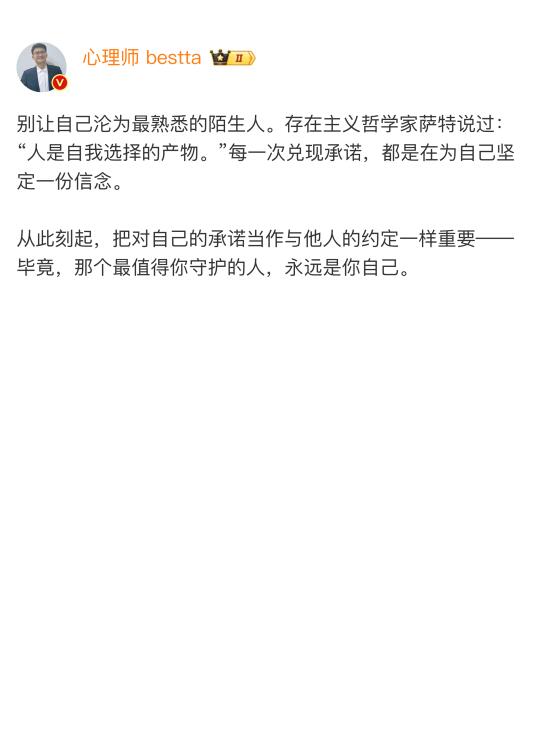 别让自己沦为最熟悉的陌生人。存在主义哲学家萨特说过:“人是自我选择的产物。”每一次兑现承诺,都是在为自己坚定一份信念。