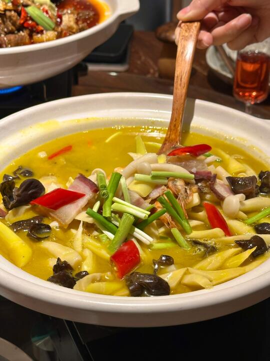 预制菜横行的时代里我偏爱的一家用心做菜的店 他们家的食材都有源可溯 只用基础调料和天然香料来调味 店里布置和环境都让人感到很放松 餐前来一壶洛神玫瑰花茶 一整朵玫瑰在茶汤里绽放 喝完感觉整个人都香香的 春三鲜锅里面用了新鲜的春笋 结合腊肉的鲜 真的是大自然最好的馈赠 爆炒牛肝菌真的比肉还好吃下饭 牛排火锅肉很大块 里面的胡萝卜也好吃 吃完整个人身心舒畅 店内还有读书角 中午来的话外面的大露台也很舒服 是快节奏的城市能够慢下来好好享受美食的地方