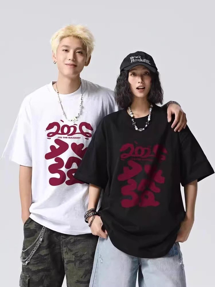 花卉刺绣小领口t恤男夏季美式重磅情侣装短