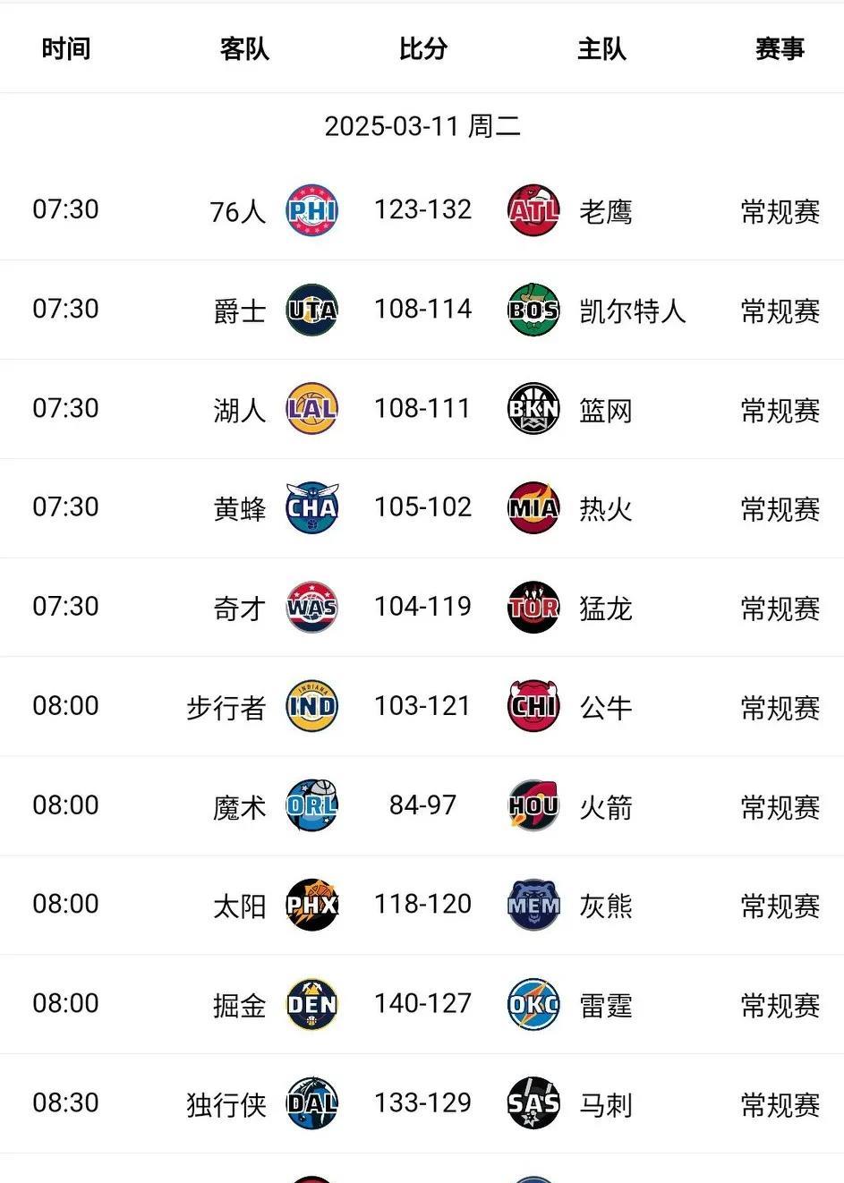 掘金140-127大胜雷霆,湖人108-111憾负七连败的篮网。掘金重返西部第二、湖人再次掉入第三,胜场差拉开到1场。 独行侠133-129马刺,太阳118-120灰熊,两者的胜场再次拉大到2.5场。