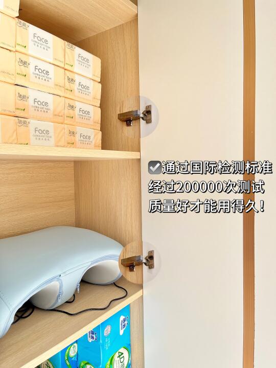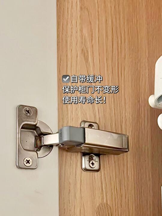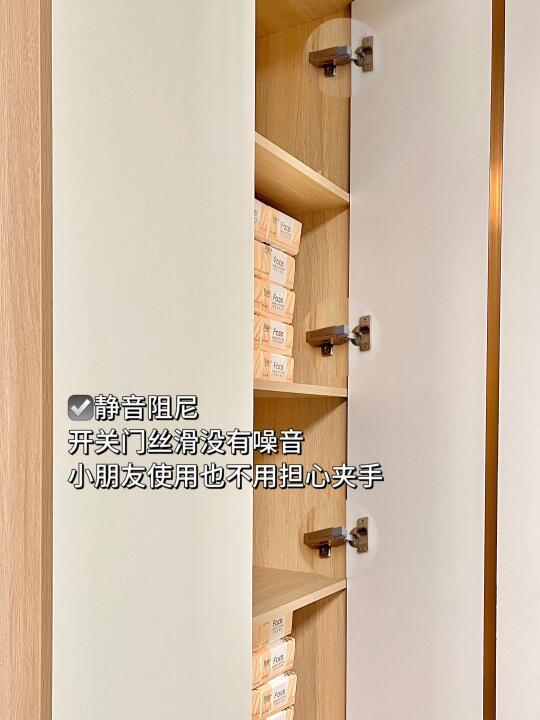 我家选用的是百%隆的铰链,大品牌用的放心。冷轧钢的材质,承重、耐磨性好,配合的外置阻尼,开关门很轻柔静音,大力开关门也会有缓冲。是国际的检测标准,还经过200000次开合测试,使用了一年多也依旧不会咔咔作响,家里有老人小孩的也不用担心会夹到手。五金配件在家具的后期使用中起到了关键性的作用,质量好才省心~