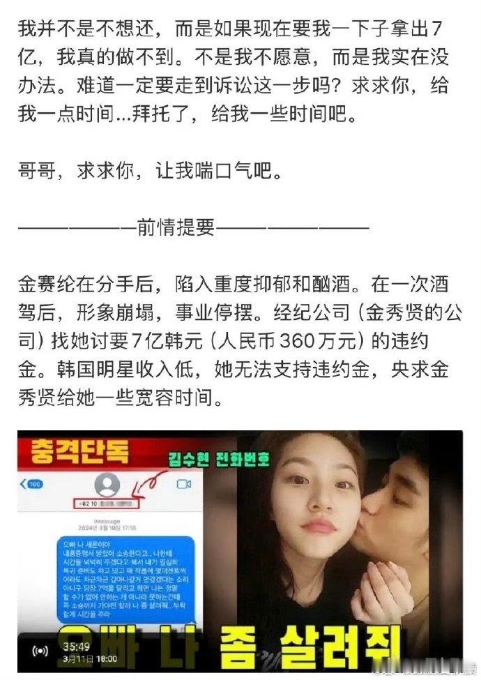 金赛纶分手后重度抑郁金赛纶分手后酗酒看到金赛纶分手后,因为重度抑郁和酗酒一步步走向绝境,才发现她真的太难了,希望悲剧不再重演 金秀贤金赛纶亲吻照