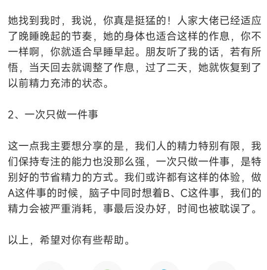 我发现有好多朋友真的精力差啊,做一件事,没过多久,人就没劲了。低精力的人,怎么提升自己的精力水平,让自己干起活来更猛呢,我分享一点看法。 1、找到自己的睡眠节奏,不要盲目学大佬的作息