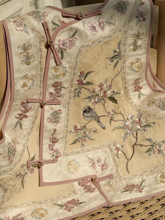 满绣的设计,海棠花的娇艳与喜鹊的灵动相互映衬,寓意喜报春光 一整件都是满满的精致细节✨