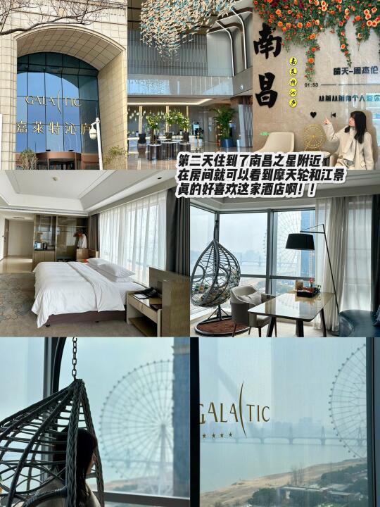📍第二天去了摩天轮附近,入住嘉莱特沁庐酒店,这个我超喜欢!躺在床上就能看见南昌之星摩天轮,三面落地窗,设施都很新很高级,完全就是理想度假酒店!床也好舒服
