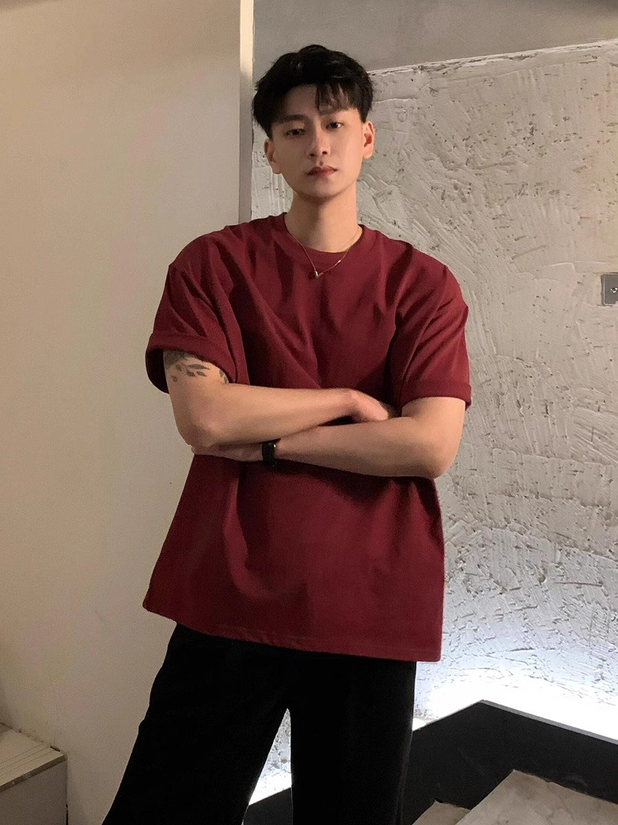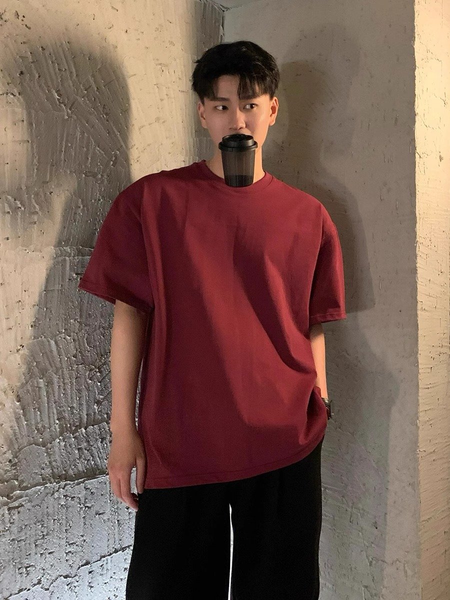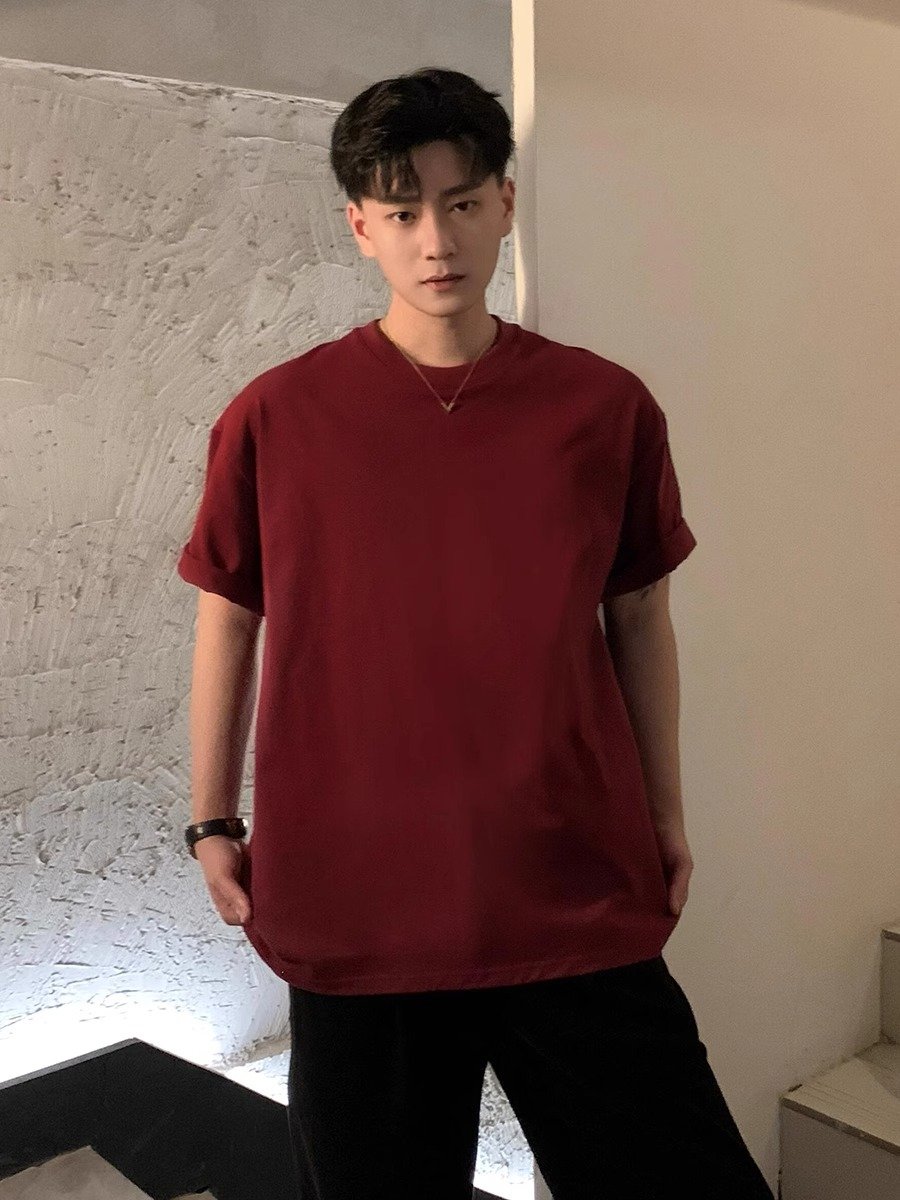 酒红色重磅正肩短袖男款夏季美式小领口纯棉