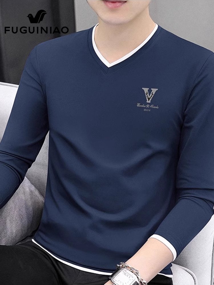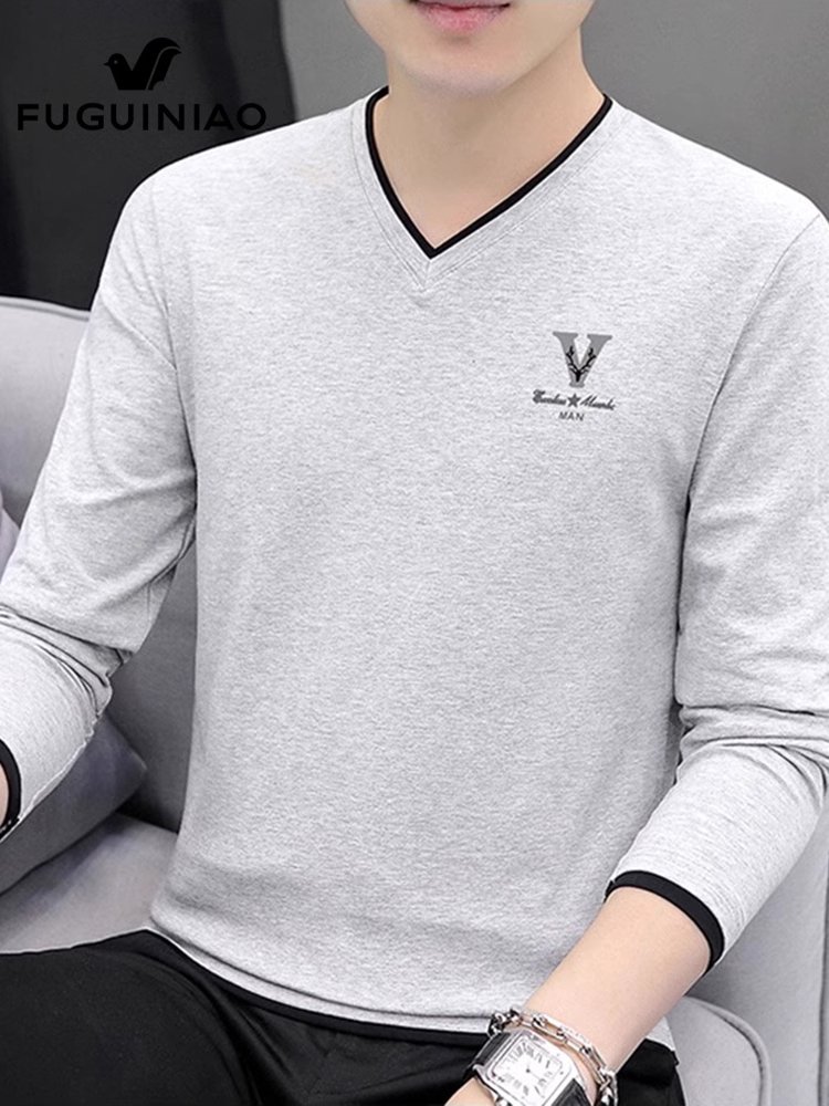 富贵鸟v领长袖t恤男士春季新款宽松休闲打底衫潮流百搭体恤衫男装