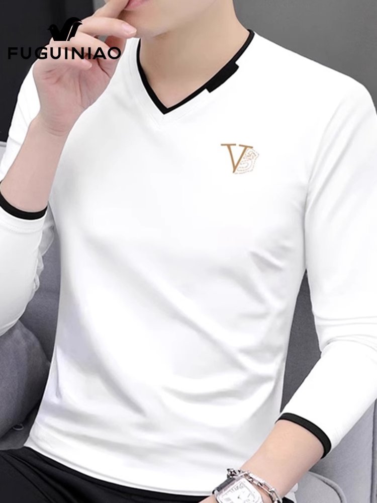 富贵鸟男士长袖t恤春季新款潮流v领打底衫宽松休闲体恤男装