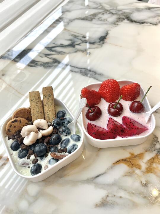 最近上了大樱桃🍒和椰皇🥥,樱桃超大颗,很新鲜没坏果!决定自制酸奶碗!选了草莓奶昔和牛油果🥑奶昔做酸奶碗的底,粉色奶昔搭配大樱桃和草莓;绿色奶昔搭配饼干🍪、蓝莓🫐和干果🌰,巧克力碎是点睛之笔~最后的成果味道和颜值兼得!大成功~