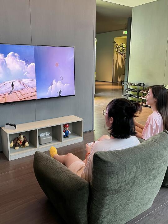吃饱喝足就找地方刷剧聊天,工作日人不太多,承包了有超大电视的公共空间,沙发形状的懒人靠椅要赞一下,比普通没形的那种舒服,还不怕靠着的地方是不是被人拿来当过脚垫😅。
