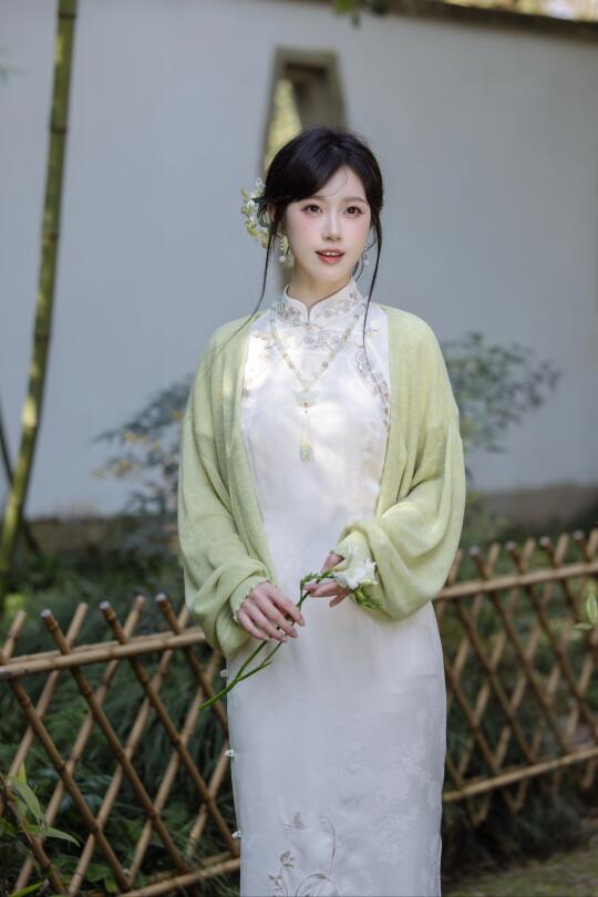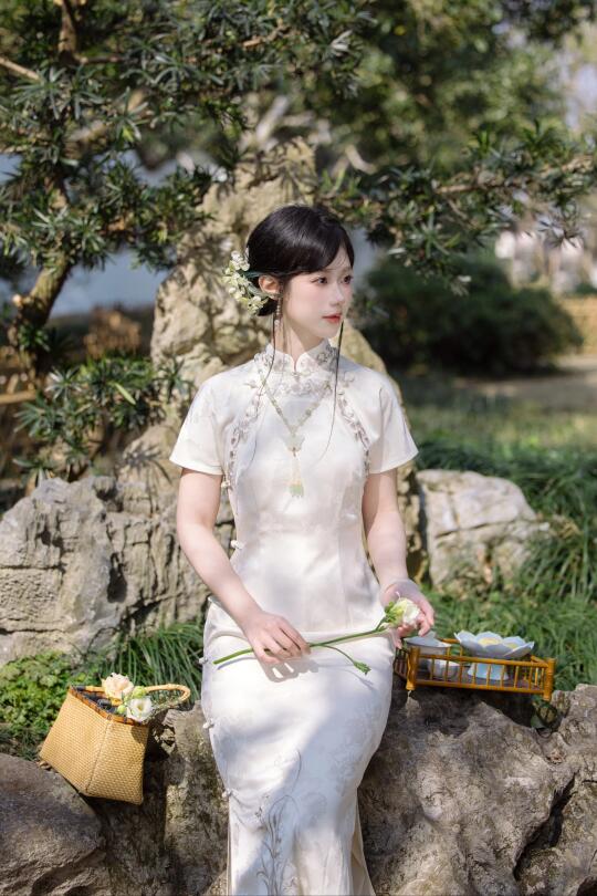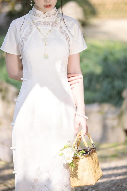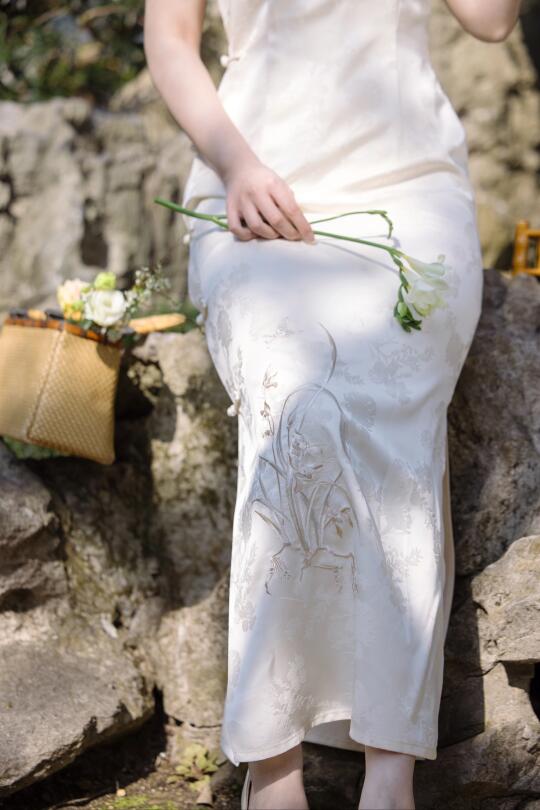 干净素雅的白旗袍来啦! 垂顺提花质感,一株幽兰刺绣点缀衣身,精致又细节~