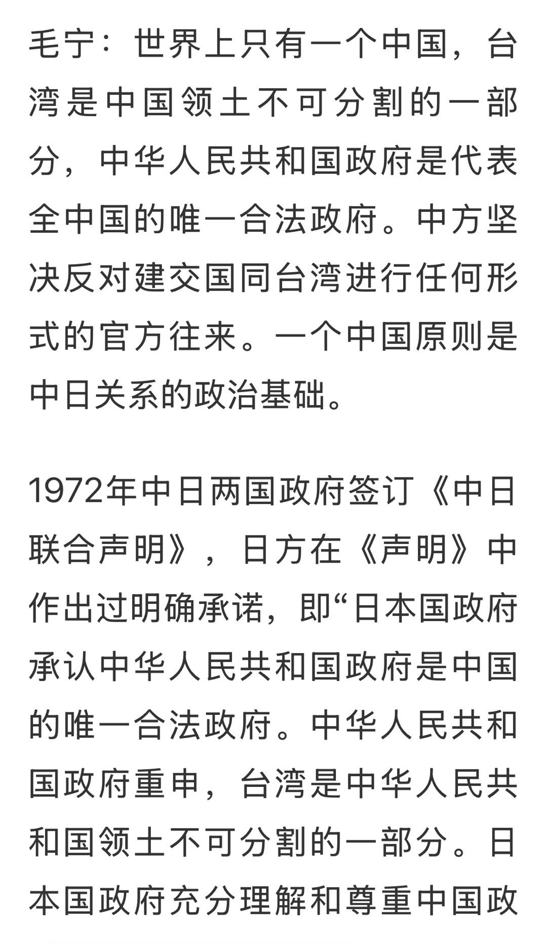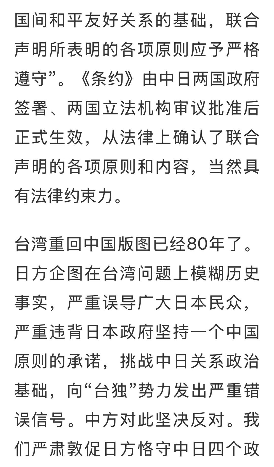 日本右翼议员公然否定《中日两国建交公报》中关于“一个中国”原则的承诺,建交公报虽然过去50多年了,但这是两国发展关系的基础和框架,是稳定器,没有这个基础,就会地动山摇。