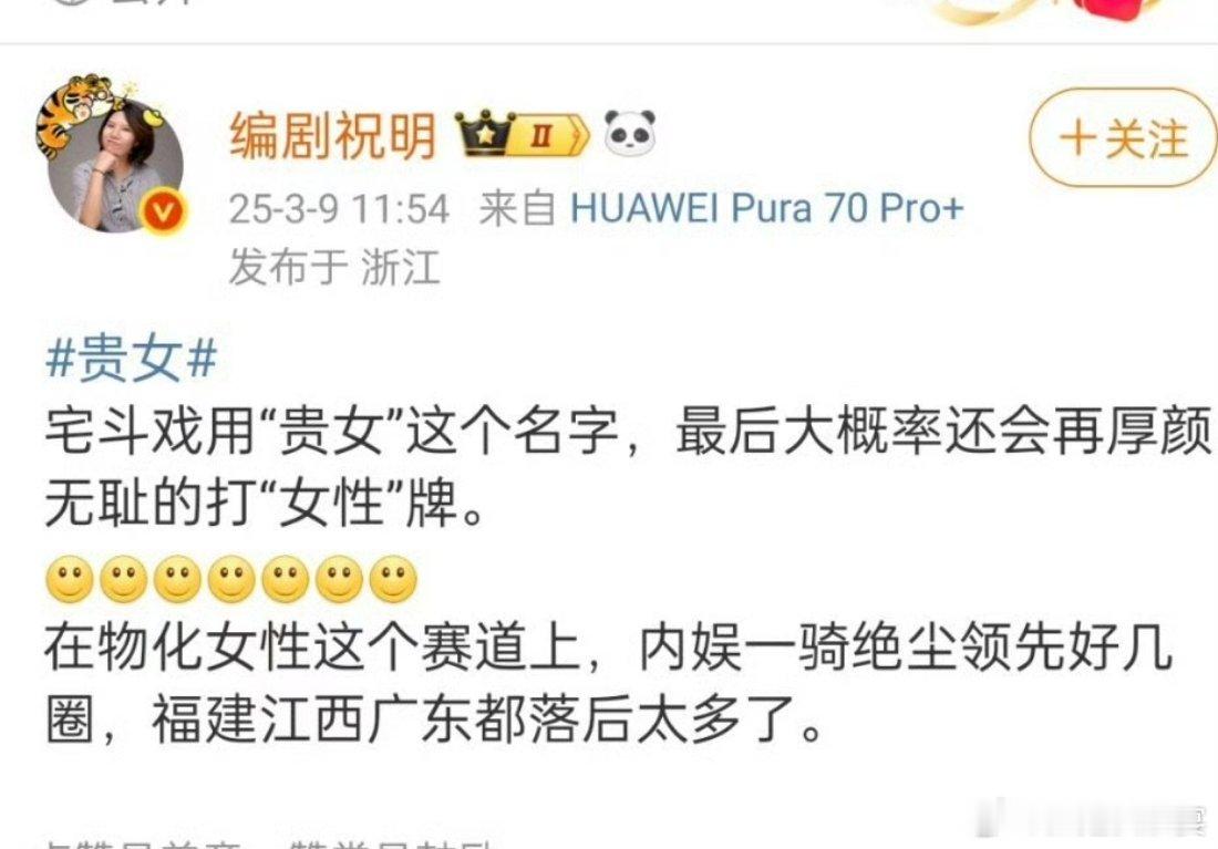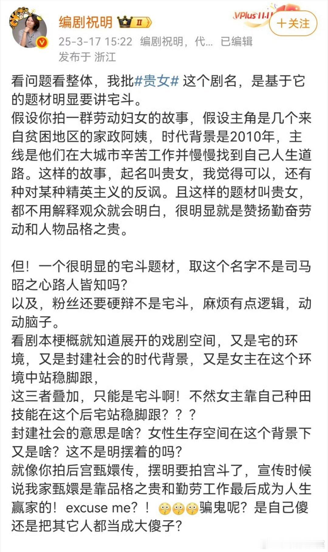 这个祝明批评的观点无外乎是给“贵女”这个词语下定义,“贵女”指身份高贵、出身优越的女性。认为这样的剧名与宅斗题材不符,甚至可能让人误解为对“贵族女性”的赞美,而非对封建制度的批判或对女性生存困境的展现。认为宅斗题材可能涉及争宠、争权等情节,容易让人联想到“狭隘”或“消极”的女性形象。这样的题材配以“贵女”这样的剧名,可能会显得不伦不类。