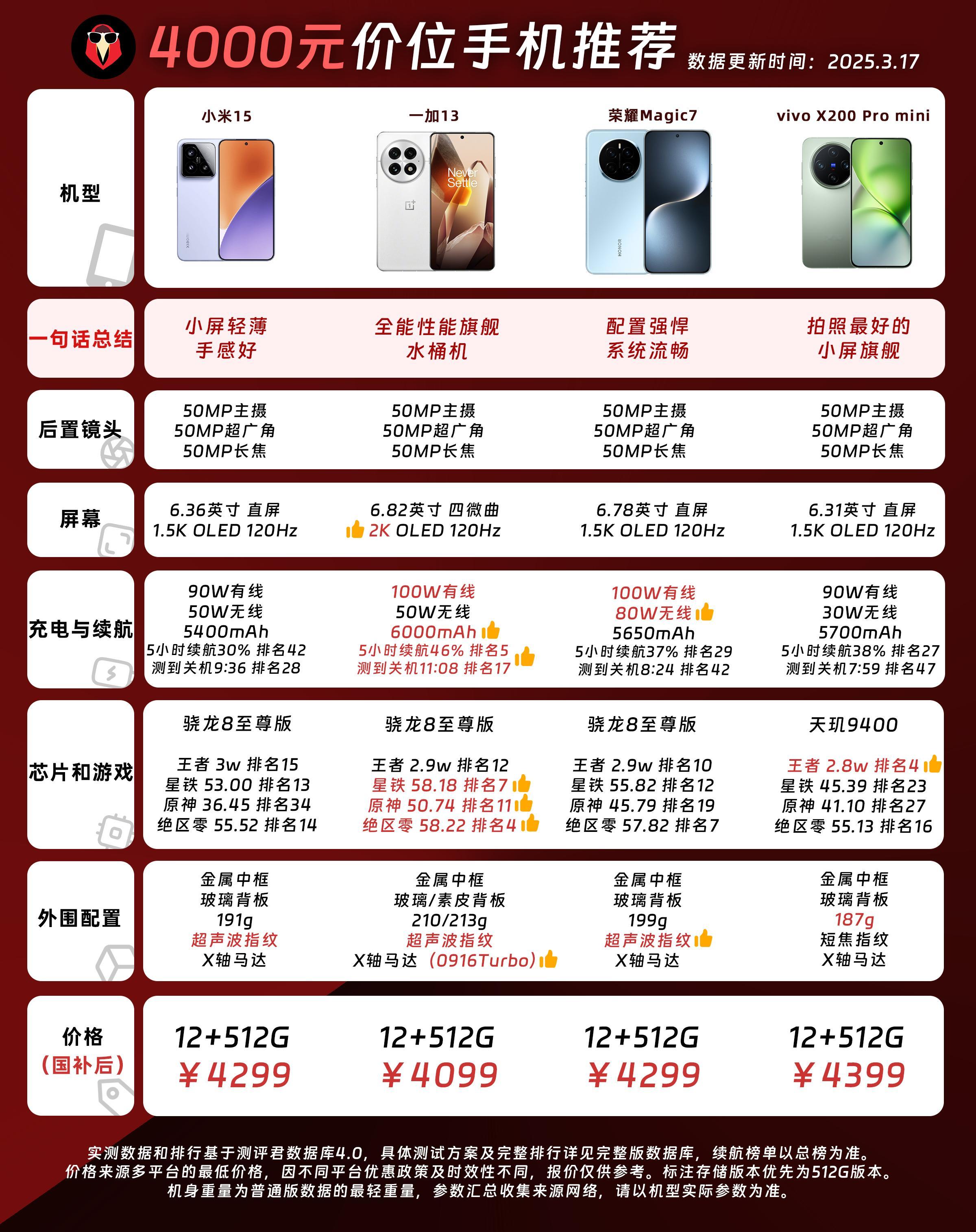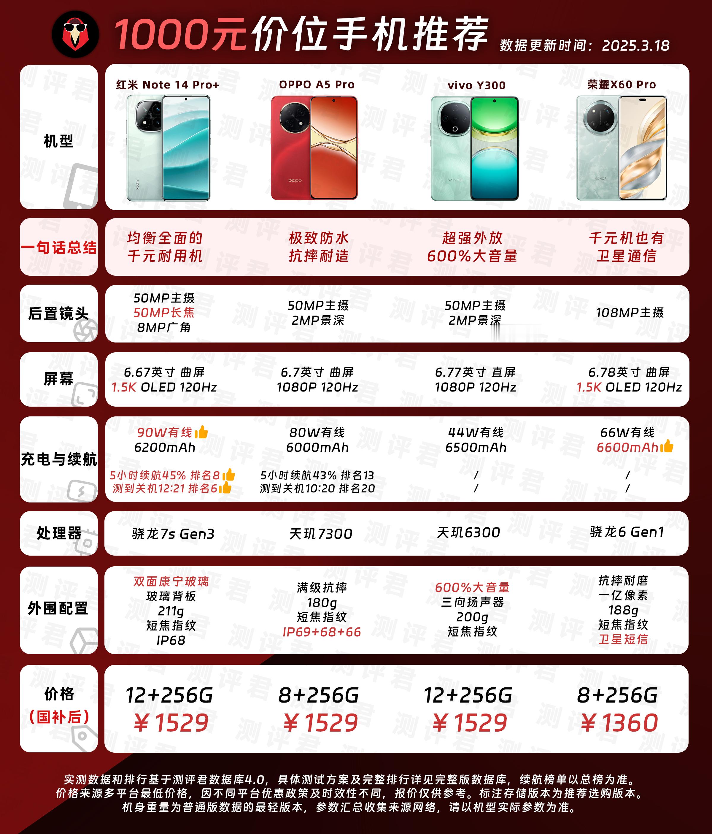 测评君数据库3月各价位手机推荐(含国补后价格)表里的都是推荐机型,包含我们的实测数据,制作不易,欢迎扩散![春游家族]