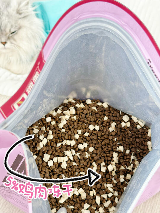 而且90%动物蛋白,符合猫咪的饮食习惯,还添加了5%鸡肉冻干,适口性很奈斯[派对R]