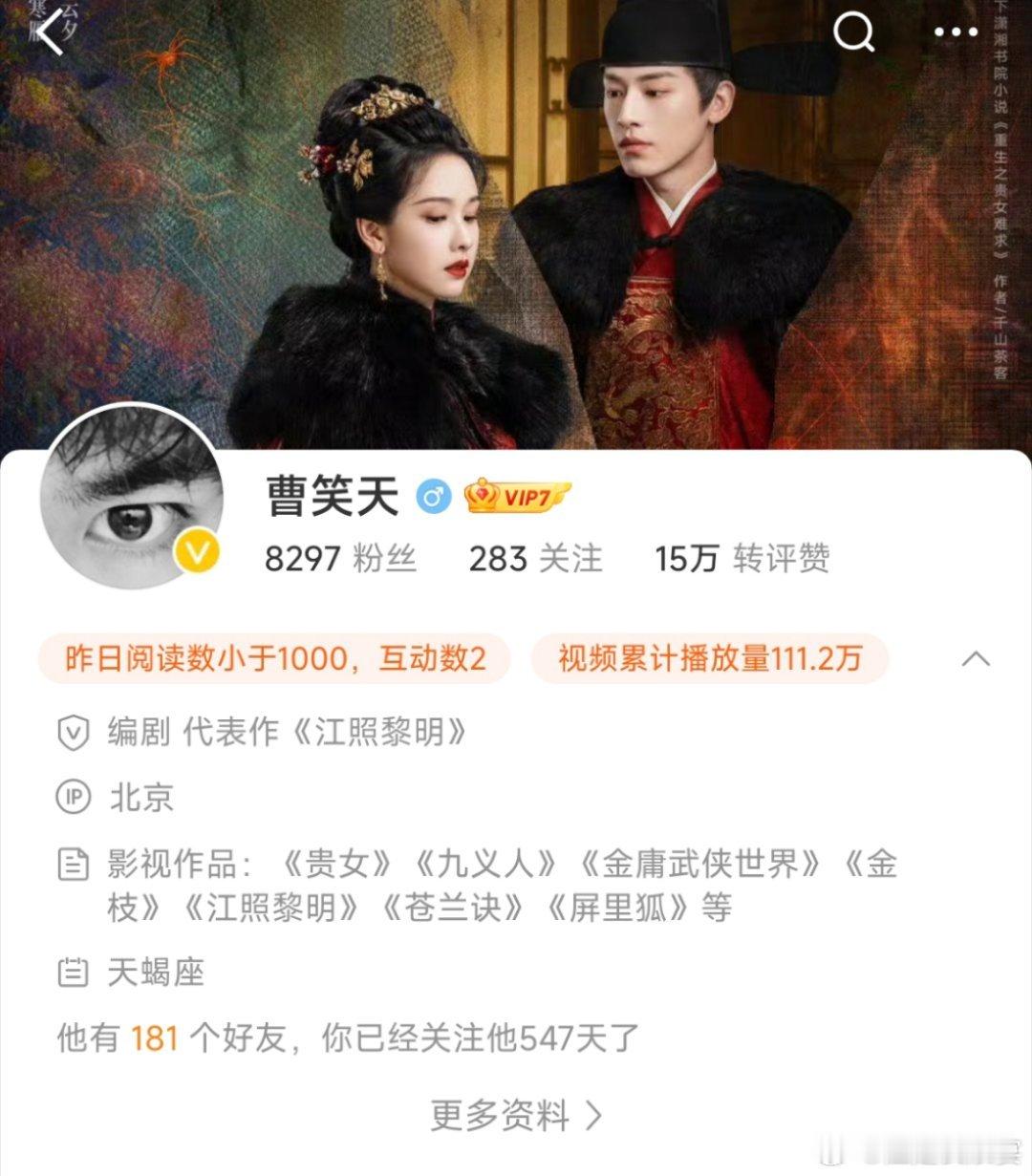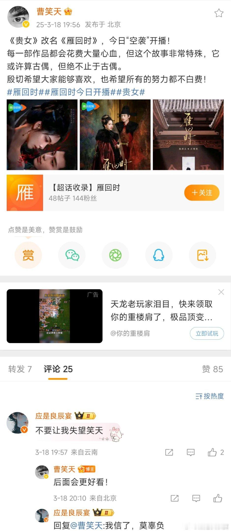 曹笑天说雁回时(贵女)后面会越来越好看,我信他了,谁让我已经关注他500多天了[doge]