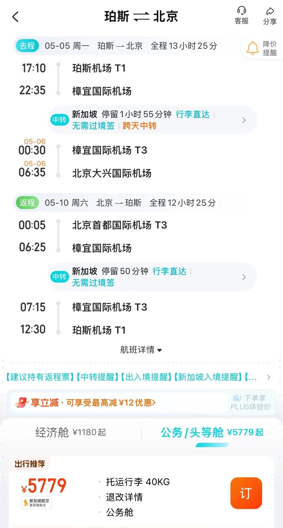 【机票Bug!澳洲往返商务舱4k 经济舱1k!】 涉及澳洲珀斯出发,往返中国内地多个城市,都有类似的Bug价,包括上海、北京、广州等等。 新加坡航空,珀斯往返内地,商务舱4k,经济舱1K!