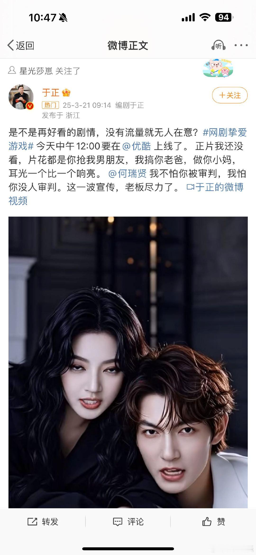 于正喊大家来看何瑞贤新剧 于正说他不怕何瑞贤被审判 于正为《挚爱游戏》疯狂打call ,何瑞贤现代剧造型太绝,剧情也是跌宕起伏,两个溺水者互拽头发的爱情,真的太抓马,太想看了!