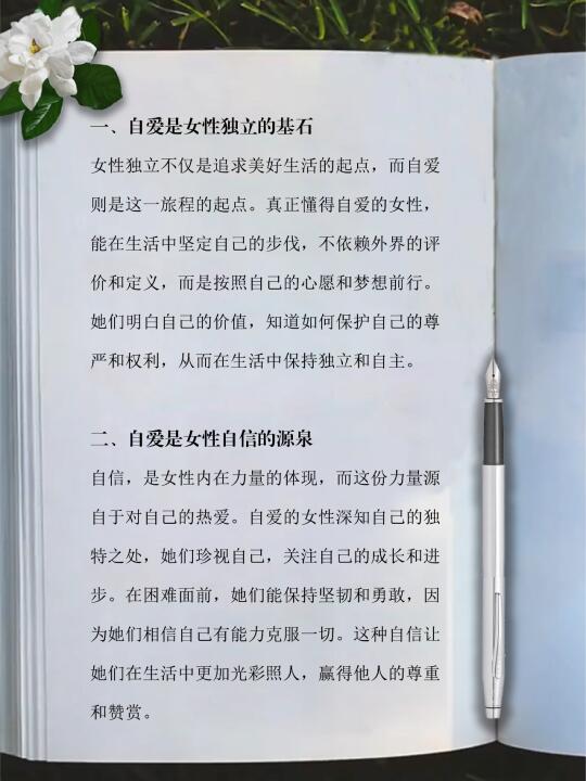 女性独立不仅是追求美好生活的起点,而自爱则是这一旅程的起点。真正懂得自爱的女性,能够在生活中坚定自己的步伐,不依赖外界的评价和定义,而是按照自己的心愿和梦想前行。她们明白自己的价值,知道如何保护自己的尊严和权利,从而在生活中保持独立和自主。