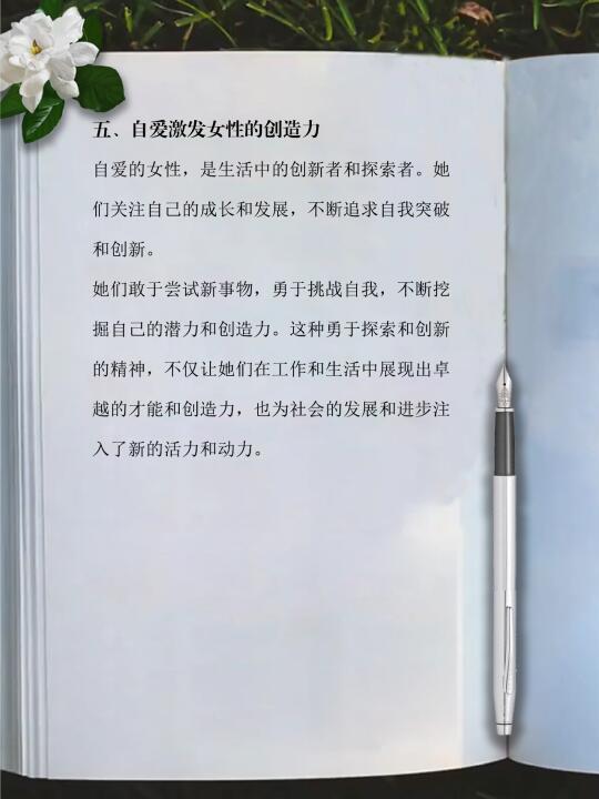 自爱的女性,是生活中的创新者和探索者。她们关注自己的成长和发展,不断追求自我突破和创新。她们敢于尝试新事物,勇于挑战自我,不断挖掘自己的潜力和创造力。这种勇于探索和创新的精神,不仅让她们在工作和生活中展现出卓越的才能和创造力,也为社会的发展和进步注入了新的活力和动力。
