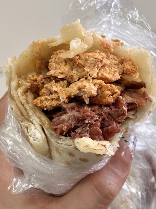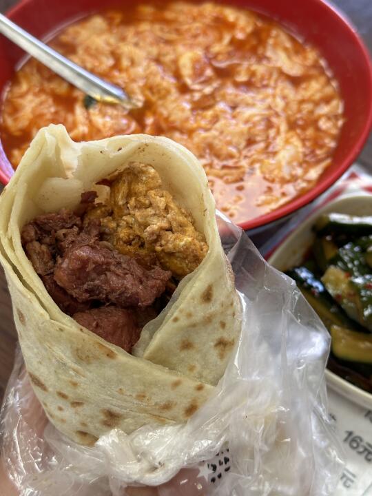 是不是只有塘沽人才吃过…… 大饼鱼籽鸡蛋牛肉➕番茄鸡蛋汤➕黄瓜条!!! 吃一次就会爱上。。。尊嘟jue配!!!!