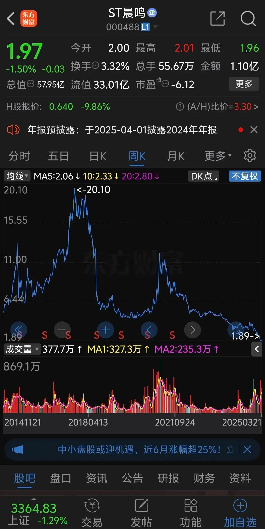 晨鸣纸业4个跌停后第5个跌停获得大量资金涌入抄底,当天转涨获得大阳线,最近股价算是企稳了,没有大起大落,十几天一直围绕2元关口反复震荡,已经到了非常关键的时候,但是上方20日均线已经往下压,而且30日均线也很快就要下来,还有一个关键点是年报也快到了,按预告看亏损幅度比较大,相比三季报大幅增亏,这个时候的投资者应该适当谨慎,虽然说股价已经从12元跌到2元,但是不一定是底部,追高股民惨不能睹。