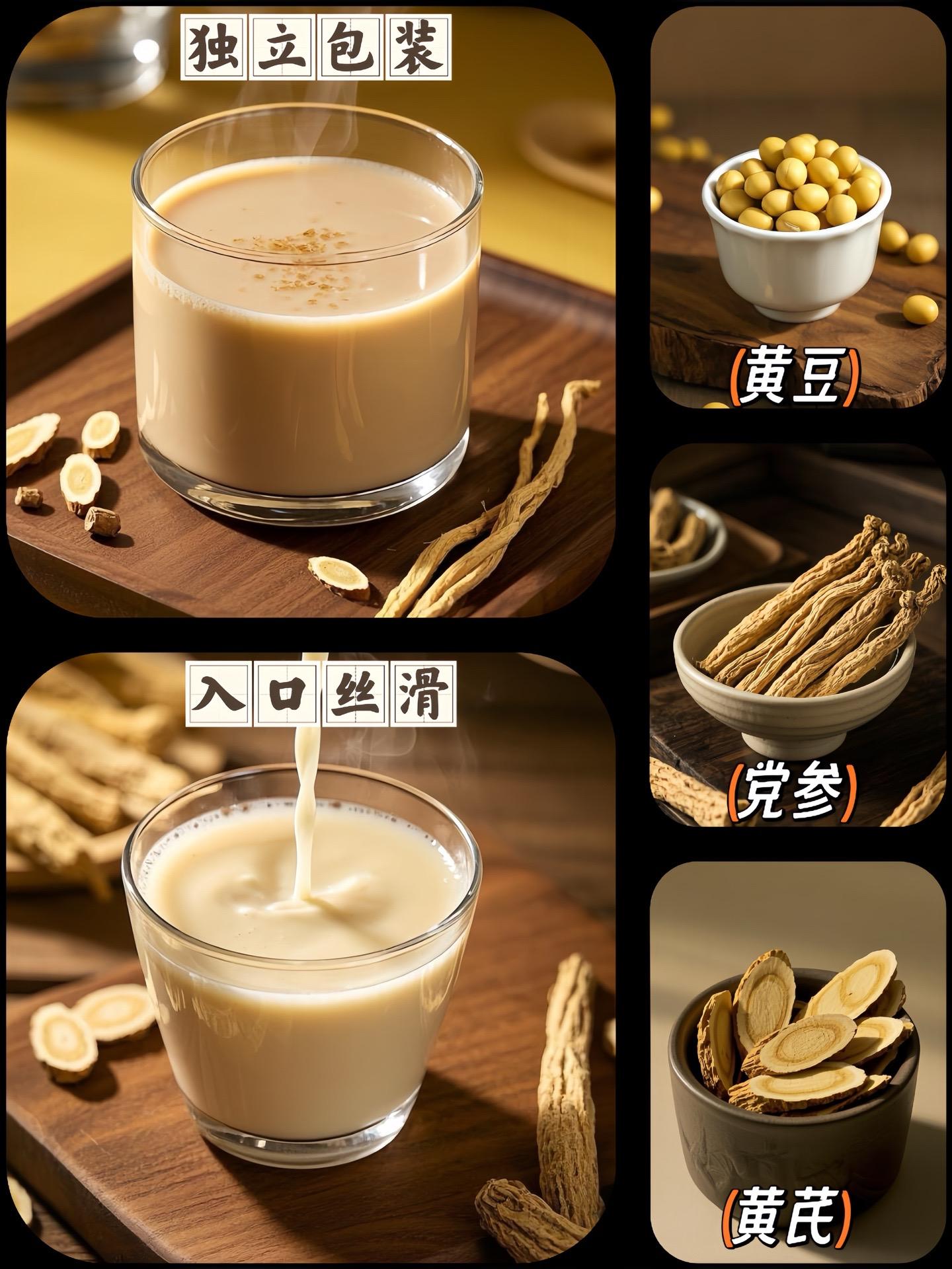 打工人都在喝的养生豆浆,后悔没早点发现!每天都在忙碌的工作里奔波,身体被掏空?试试这款黄芪党参豆浆粉,开启元气满满的一天 ! 它可不是普通的豆浆,精选优质黄豆,搭配黄芪、党参等天然食材,科学配比,精心研磨,每一口都满满都是营养。开水一冲,浓郁豆香混合着草本的清香扑鼻而来,入口丝滑,醇厚甘甜,温暖又治愈。 黄芪补气固表,党参健脾益肺 ,对于长期熬夜、压力大的打工人来说,简直是养生救星!喝上一杯,仿佛给身体注入满满能量,精神一整天 。
