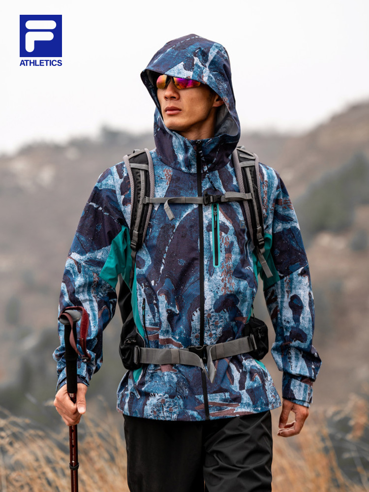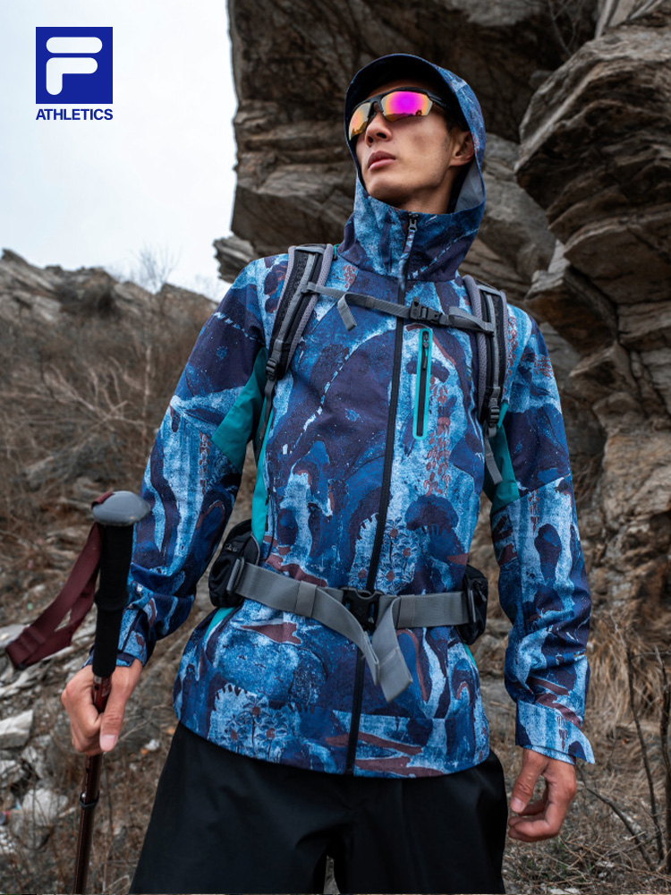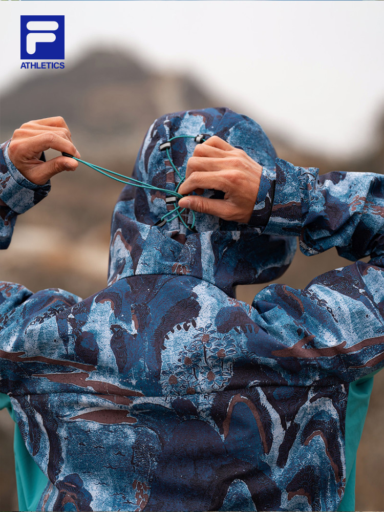 整身图案是提取敦煌元素的壁画,作为灵感来源;户外专属防护帽沿和马蹄袖口,为户外出行保驾护航;帽子后使用特殊的线绳设计,可以根据自身需求调节松紧度