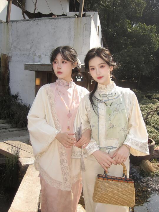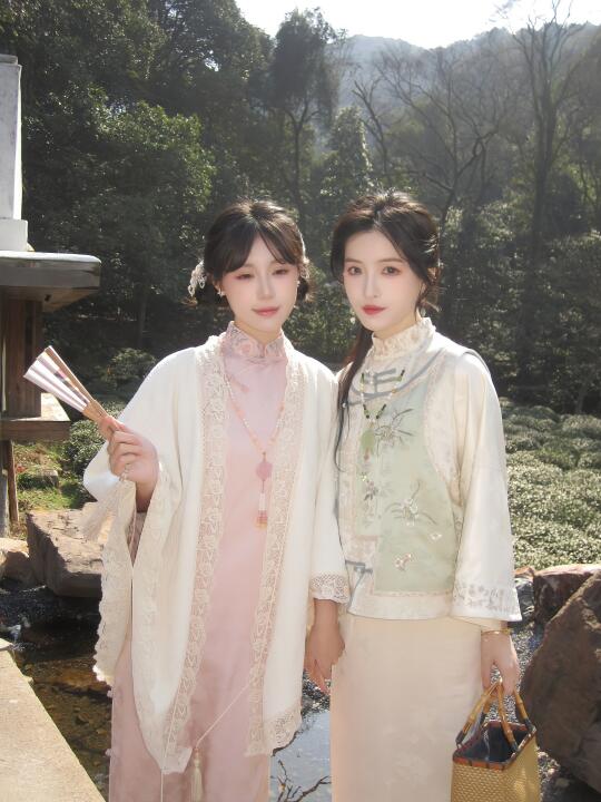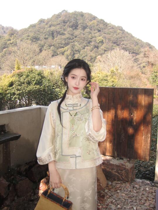 绿色系刺绣小马甲,搭配缎面旗袍也太清新温柔了叭! 我的春日出游穿搭+1
