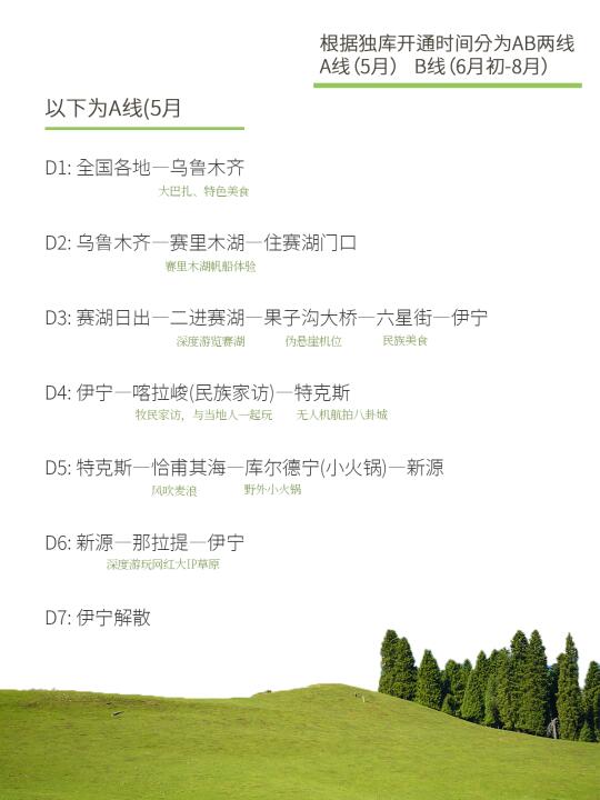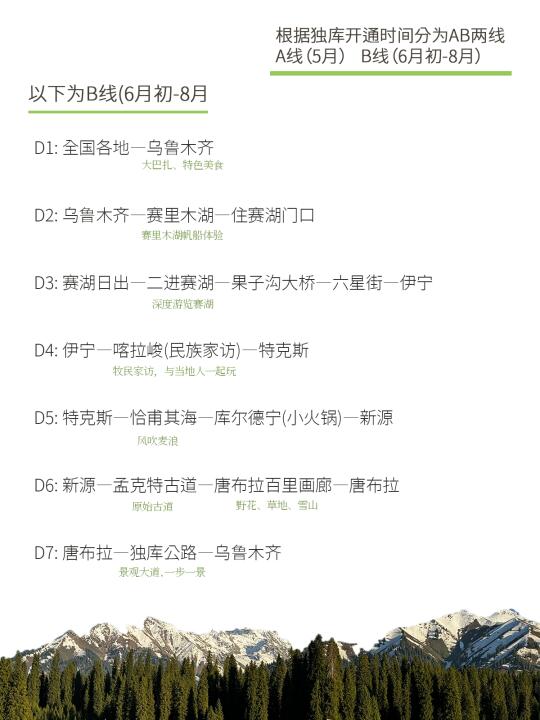📣本次旅行分为A、B两线,(以独库公路开通为标准)在不同阶段设计时令路线,让朋友们来到伊犁都能看到当下醉美的风景