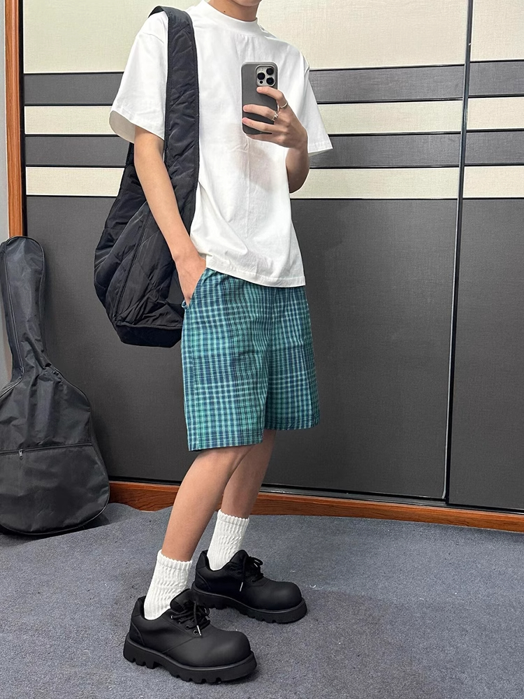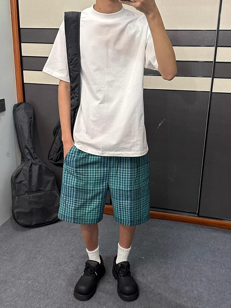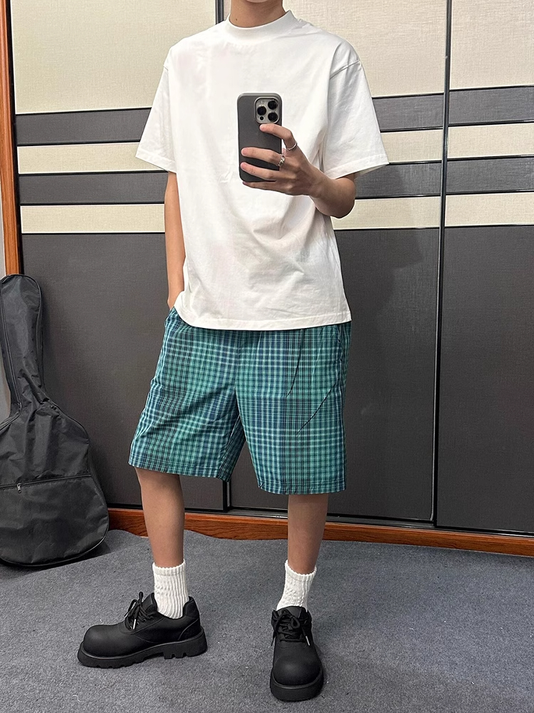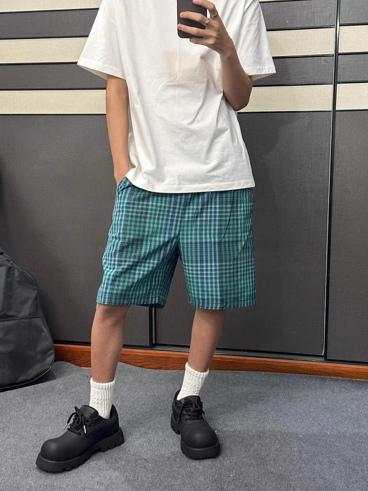 蓝绿色格子短款男夏季薄款宽松休闲运动裤子