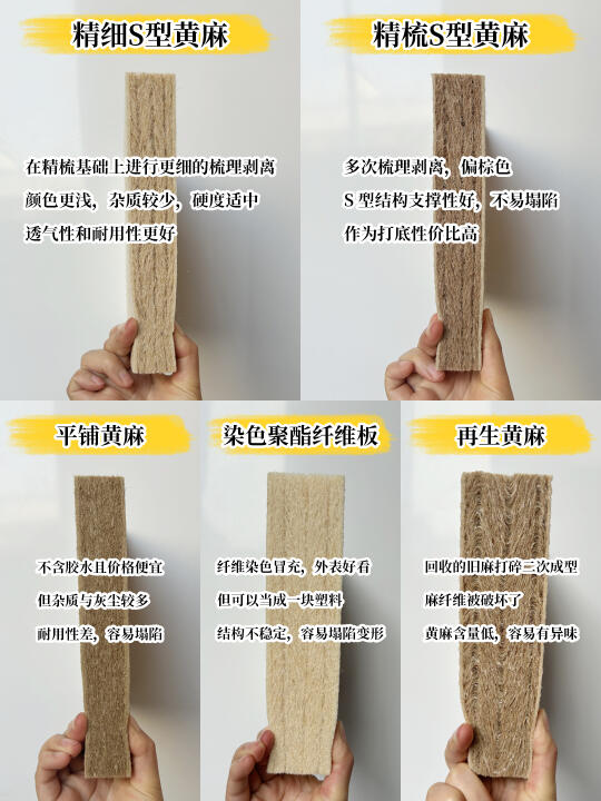 👉S型精梳黄麻:多次梳理剥离,偏棕色,S型结构支撑性好,不易塌陷,