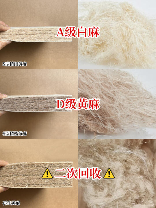 👉回收麻:回收的旧麻打碎二次成型,麻纤维被破坏了,黄麻含量低,容易有异味。