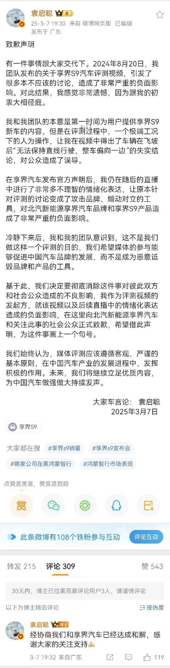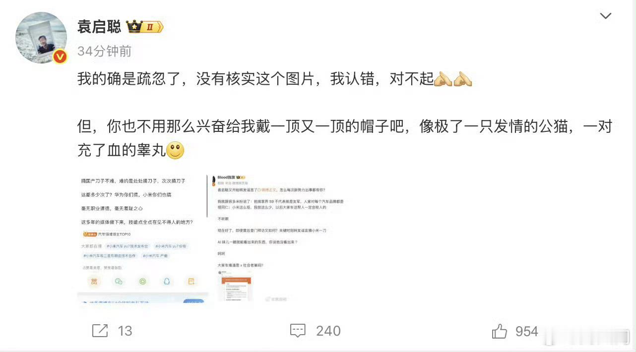 小米打假雷军致公众的一封信 袁启聪造谣完华为又造谣小米,这也是车圈讹人要合作的老套路了,靠发负面去逼迫车企合作,但可惜你遇到的是华为和小米,这种恶臭媒体,贱人贱己贱行业,如果你不是故意的,为啥每次都有你??