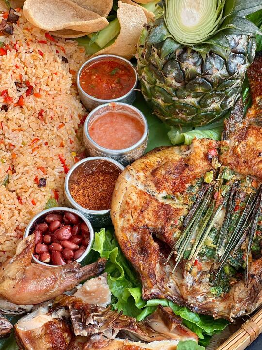 一盘“孔雀屏”里有鱼有肉有主食还有甜品~建议先吃烤鱼!外焦里嫩热的时候吃比较香,接下来可以吃烤鸡🍗和猪肉,猪肉直接蘸辣椒面的干叠吃绝了,觉得腻还可以卷生菜🥬,我听旁边桌的小姐姐想加一点黄瓜片🥒店家也会加,非常清爽解腻~里面有一个粑粑很有特色,扁扁的被粽叶包着,第一次吃,不是很甜又股清香~