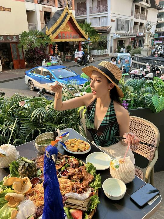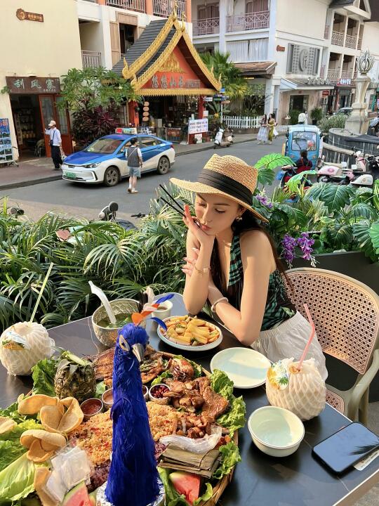 当时本来想坐室内,结果五点多靠窗的位置就都满了,于是选择了室外的观景位🛋️,服务员还贴心的帮我们打开了遮阳伞,没想到拍出来好像泰国街头的感觉!伴着夕阳🌇吃着傣味特色真的很惬意~