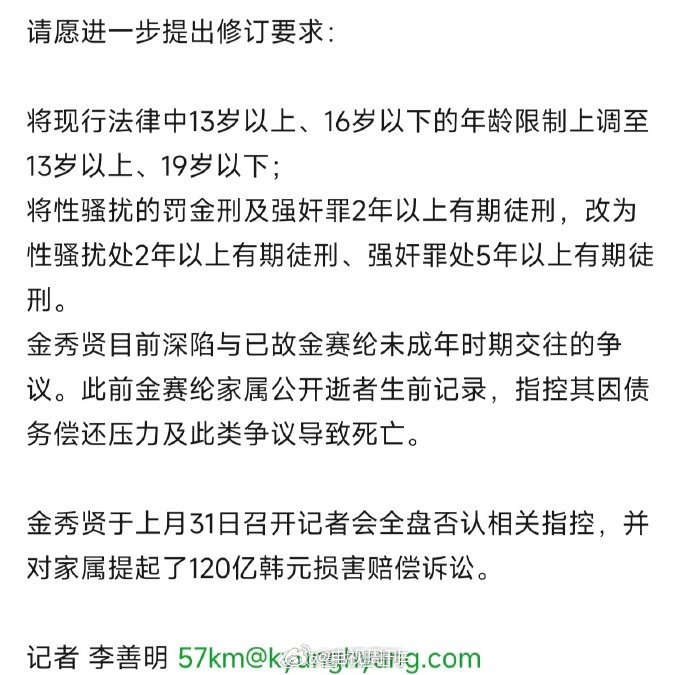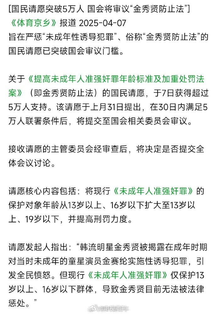 金秀贤防治法请愿超5万人韩国会将审议金秀贤防治法 超 5 万民众踊跃参与《金秀贤防治法》请愿,进度 100%达成,法案提交国会相关委员会审议后,通过提高未成年性自主决定权年龄,为未成年人保驾护航。