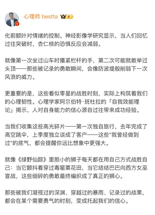 更重要的是,这些看似零星的战胜时刻,实际上构筑着我们的心理韧性。心理学家阿尔伯特·班杜拉的「自我效能理论」揭示,人对自身能力的信心源自可验证的成功经验。