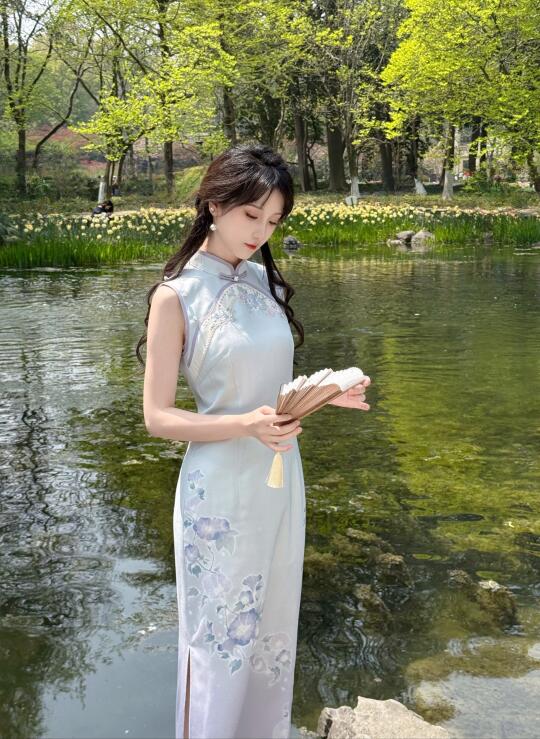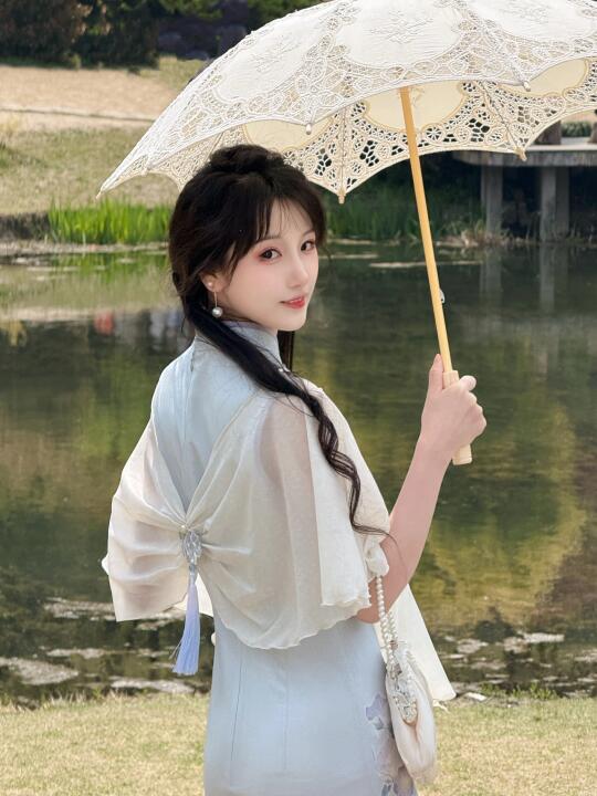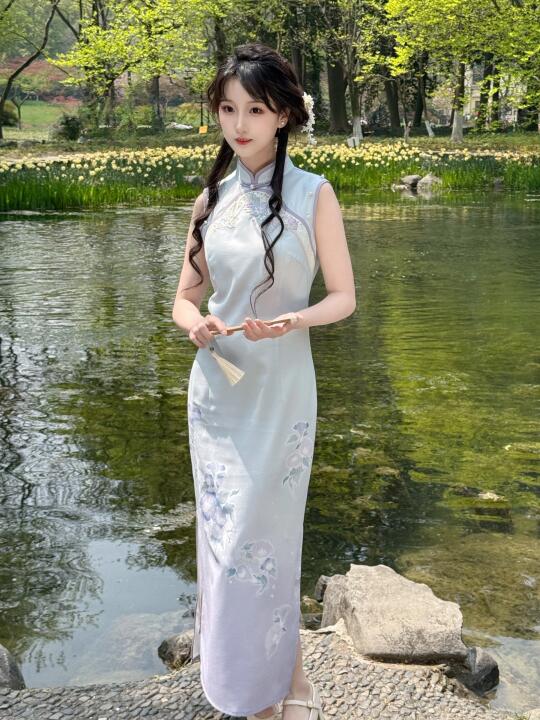 是明媚有生命力的夏天~ 将那一抹蓝紫色绘制于衣间,裙衫轻摆 花影摇曳,浪漫又灵动~ — 无袖旗袍+可拆卸袖披肩,两种穿法,日常清凉与古典造型随意切换