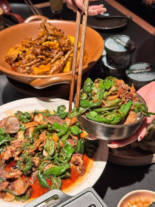 找到了性价比又高口味又正的湘贵菜店🌿 「湘味草鸡」鸡肉🐓嫩滑不柴,吸饱了辣椒🌶️的鲜香,米饭的zui佳cp! 「湖南辣椒炒肉」五花肉薄片与新鲜辣椒🫑的碰撞,油脂与辣味的结合,吃起来一点也不腻 「羊肉串」🍢烤得恰到好处,膻味全无 「冰川茄子」茄子🍆软糯入味,甜甜的口感,超爱他的外皮,值得一尝 「黑松露炒饭」简直是gao档料理的级别,米饭🍚粒粒分明,黑松露的香气与饭香交织,每一口都是惊喜