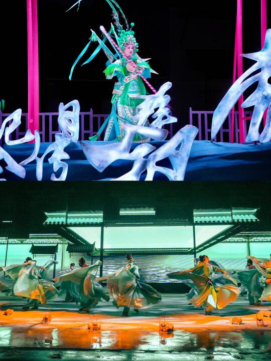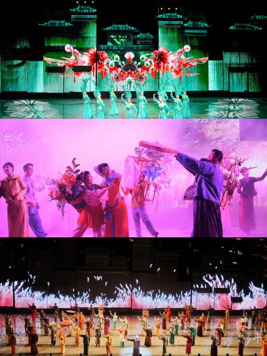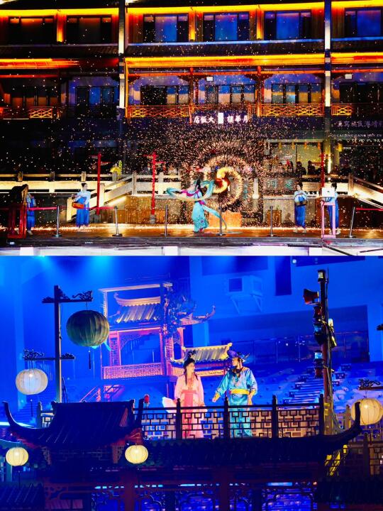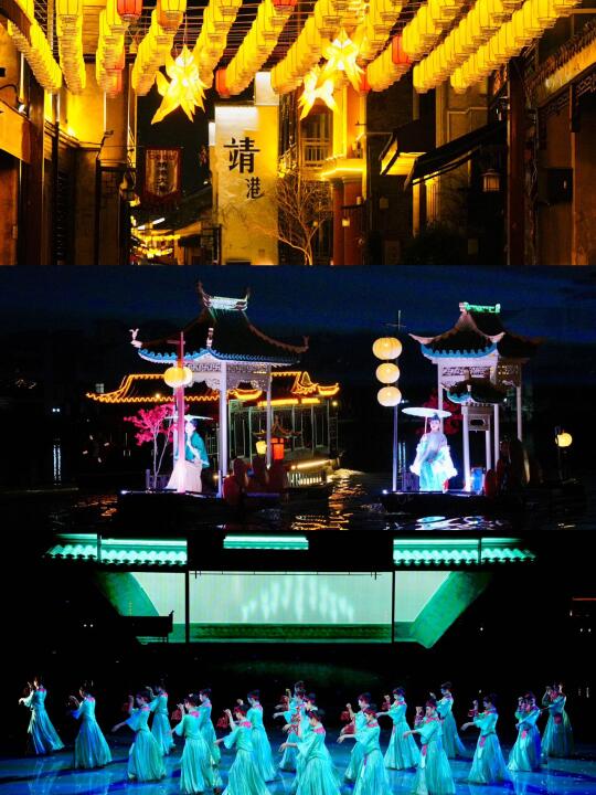 - 日间演艺:有水上婚礼《江语花前》从水上一直到岸上,整个婚礼队伍浩浩荡荡;上岸后观看一场充满怀旧氛围的超时空复古派对演出:《黄金年代“捌零”奇妙夜》,和演员一起在霞虹闪烁的舞池中感受80年代...~红色戏剧《母亲的歌》演员们的信念感超强,还有《帆归靖港》首创行船威亚、古镇彩灯竹龙等特色亮点。这热闹必须凑一凑!!!