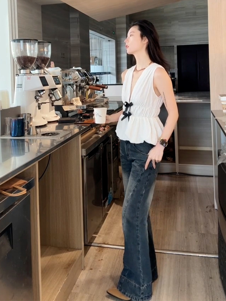 春季洋气独特别致法式上衣轻奢高级感白色荷叶边无袖V领衬衫女夏