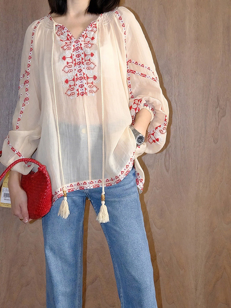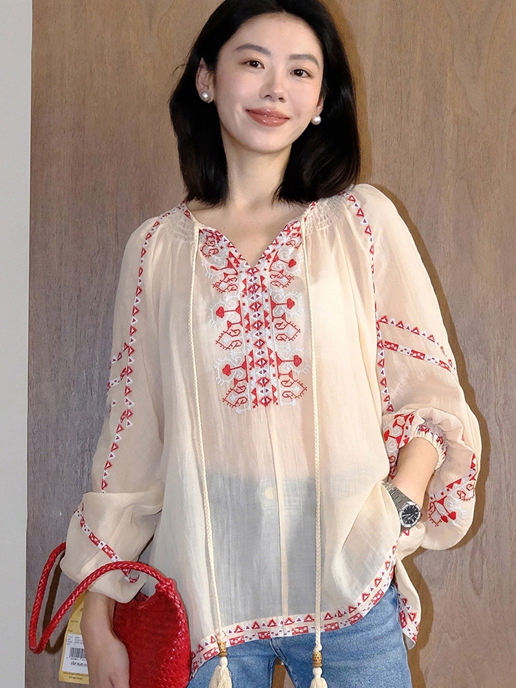 2025初夏独特超好看上衣波西米亚民族风粉色刺绣雪纺防晒长袖衬衫