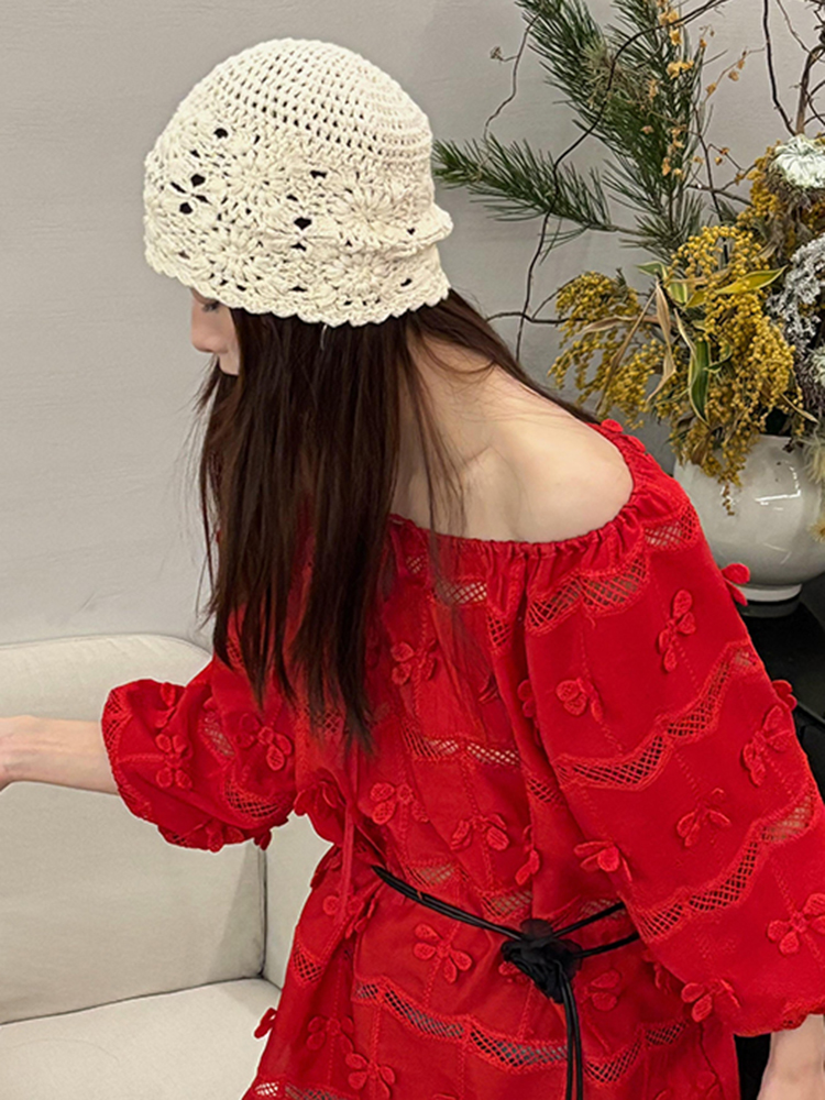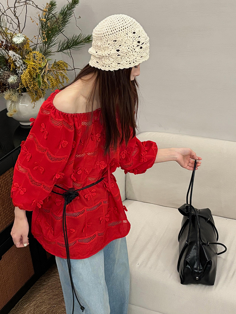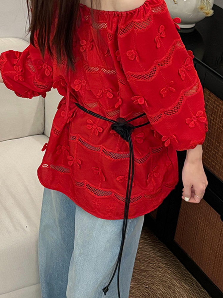 高级感轻奢减龄洋气镂空一字肩红色衬衫女