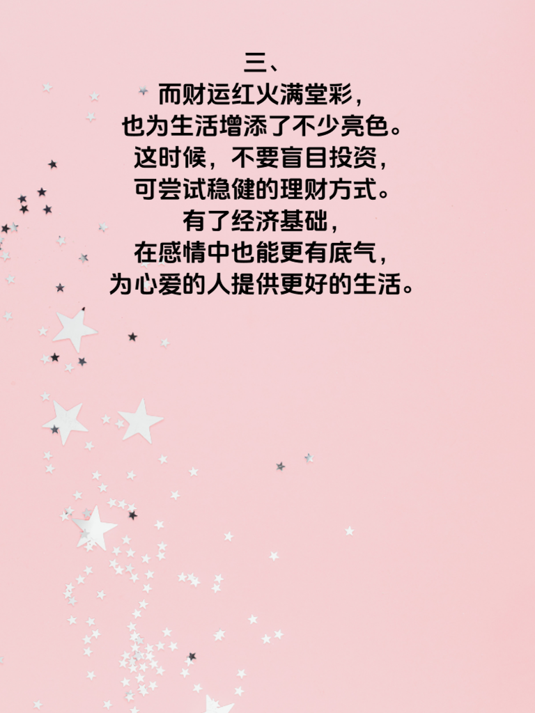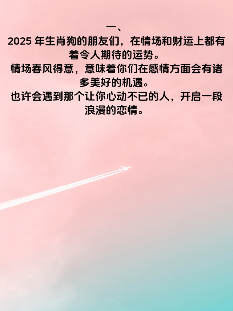 一、2025年生肖狗的朋友们,在情场和财运上都有着令人期待的运势。情场春风得意,意味着你们在感情方面会有诸多美好的机遇。也许会遇到那个让你心动不已的人,开启一段浪漫的恋情。 二、在追求爱情的道路上,生肖狗的男生要发挥自身真诚、可靠的优点。用真心去对待心仪的女生,关心她的喜怒哀乐。适时地制造一些小惊喜,比如在特殊的日子送上精心准备的礼物。 三、而财运红火满堂彩,也为生活增添了不少亮色。这时候,不要盲目投资,可尝试稳健的理财方式。有了经济基础,在感情中也能更有底气 ,为心爱的人提供更好的生活。 四、无论是情场还是财运,都需要我们用心去经营。抓住情场的机会,努力展现自己的魅力,同时合理规划财富,让2025年成为生肖狗们收获满满的一年,爱情甜蜜,财富充裕。