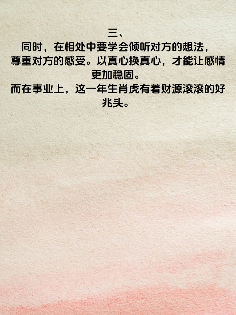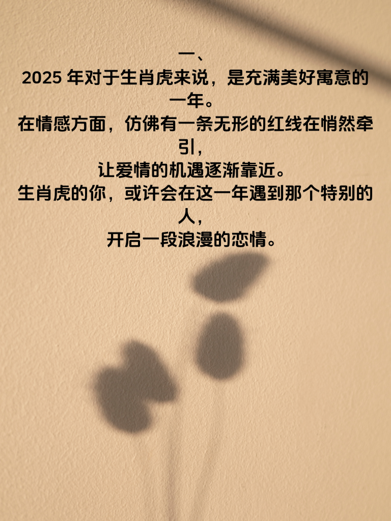 一、2025 年对于生肖虎来说,是充满美好寓意的一年。在情感方面,仿佛有一条无形的红线在悄然牵引,让爱情的机遇逐渐靠近。生肖虎的你,或许会在这一年遇到那个特别的人,开启一段浪漫的恋情。 二、想要抓住这份情牵红线的缘分,你需要展现出自信与热情。生肖虎本就自带气场,在追求心仪之人时,更要发挥自身优势。主动出击,真诚地表达自己的心意,不要害怕被拒绝。 三、同时,在相处中要学会倾听对方的想法,尊重对方的感受。以真心换真心,才能让感情更加稳固。而在事业上,这一年生肖虎有着财源滚滚的好兆头。 四、凭借自身的努力和智慧,能够收获满满的财富。但也要记得,感情并非金钱可以衡量,不要因为追求财富而忽略了身边的爱人。 五、在这福满门的 2025 年,愿生肖虎的朋友们既能情牵红线,收获甜蜜爱情,又能财源广进,让生活充满幸福与喜悦,实现爱情与事业的双丰收。