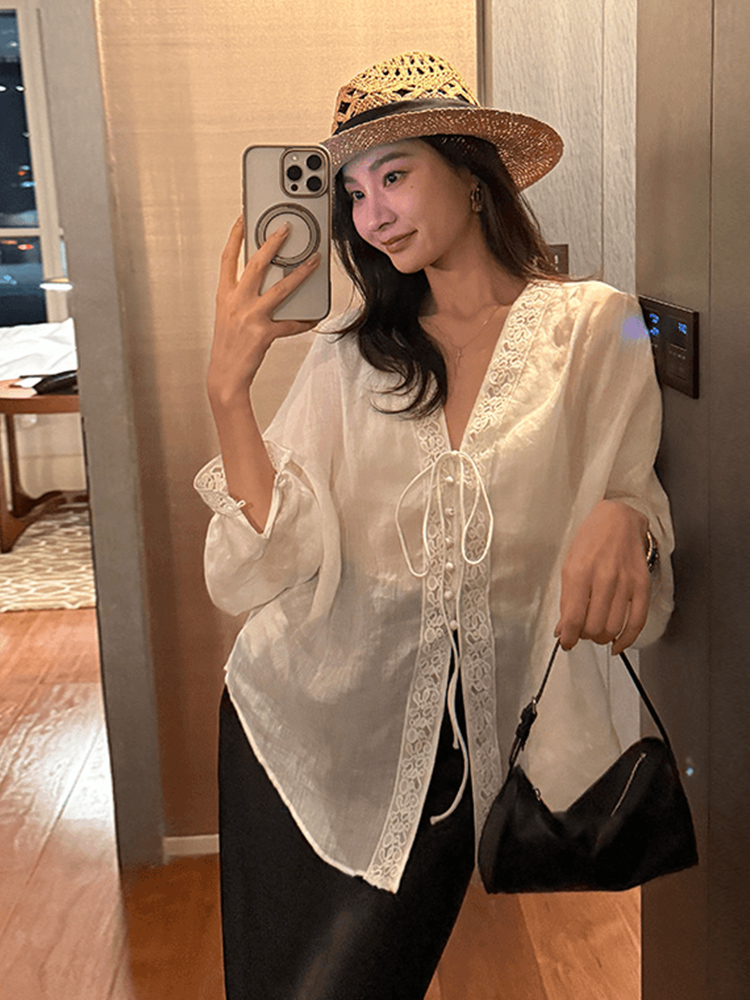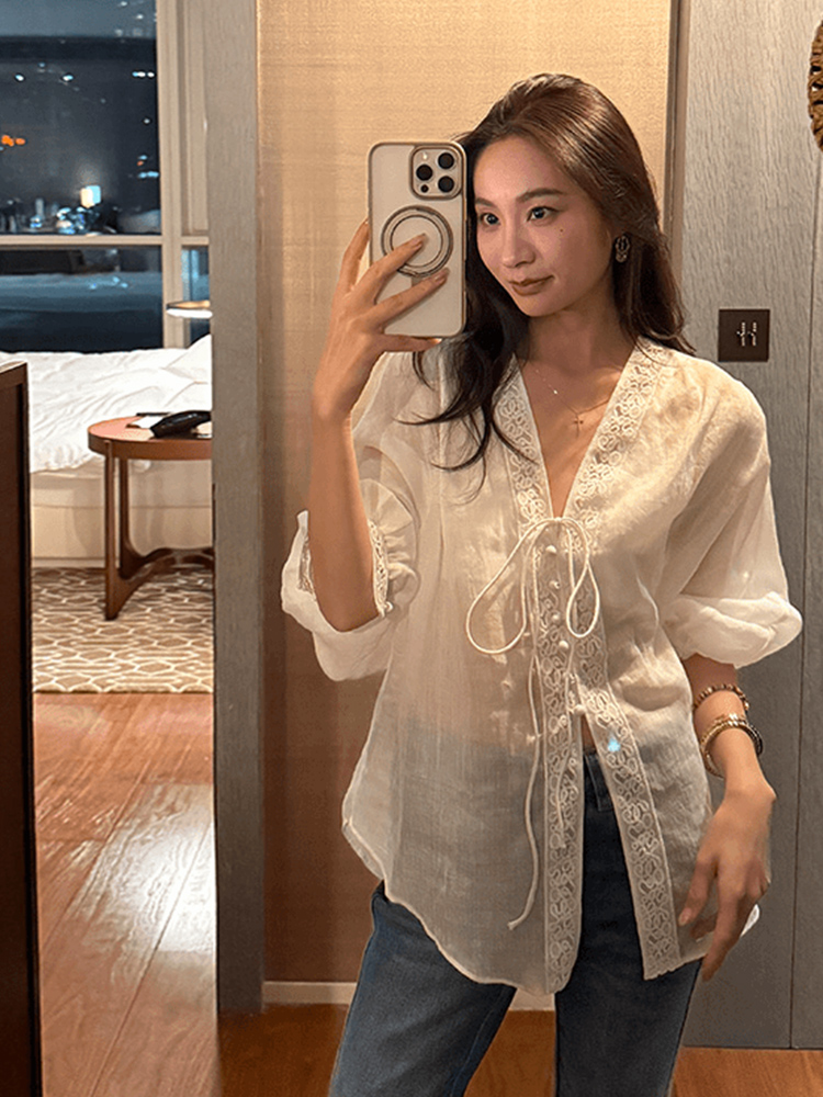 减龄高级感白色刺绣亚麻防晒长袖衬衫